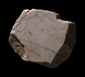 Description In February 1980, E. Rodríguez-Almeida joined blank fragments ni019, ni019b, and ni019c (Rodríguez-Almeida 2001, p. 69, figs. 10-12). The join was made possible by the presence of a tassello hole in the back of the fragments, rectangular in shape and measuring over 8 x 5 cm and ca. 4 cm deep. Together, the three fragment cluster measures 28 x 21 cm, and is 70-71 mm thick, with some pink coloration characteristic of dissolved minium. Rodríguez-Almeida has made pencil markings across the fracture lines on both the front and back surfaces of the fragments to aid in their reunion. The marble characteristics, coloration, and thickness suggest that these fragments may belong with the same slab as fragments ni069, ni087, ni144, and ni233.