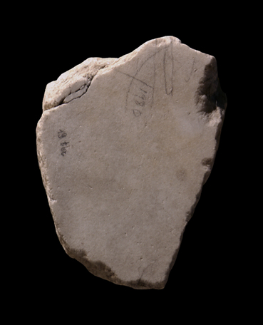 Identification There were many blank areas on the Marble Plan, including the spaces occupied by the Tiber River (see fragment 24d), by gardens, arenas, temple precincts and courtyards--in short, any space devoid of architecture or human construction. In addition, several rows of large marble slabs occupied the entire lower part of the wall of the aula on which the Plan was placed, and probably also the other walls in the room. Blank fragments like this one could have originated from any of these areas.