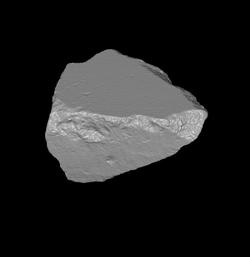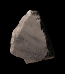 | Description This unincised fragment measures about 9x12 cm and is 77 mm thick. One edge of the fragment is flat and may correspond to a slab edge. There is a strong veining pattern on the top surface that makes an approximately 45 degree angle to the flat boundary edge.