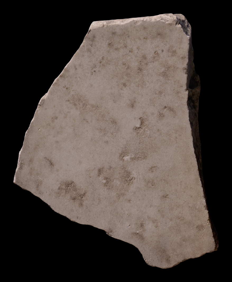 Identification There were many blank areas on the Marble Plan, including the spaces occupied by the Tiber River (see fragment 24d), by gardens, arenas, temple precincts and courtyards--in short, any space devoid of architecture or human construction. In addition, several rows of large marble slabs occupied the entire lower part of the wall of the aula on which the Plan was installed, and perhaps other walls as well. Blank fragments like this one could have originated from any of these areas.