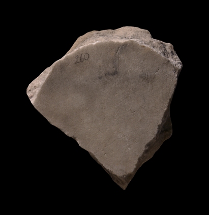 Identification There were many blank areas on the Marble Plan, including the spaces occupied by the Tiber River (see fragment 24d), by gardens, arenas, temple precincts and courtyards--in short, any space devoid of architecture or human construction. In addition, several rows of large marble slabs occupied the entire lower part of the wall of the aula on which the Plan was installed, and perhaps other walls as well. Blank fragments like this one could have originated from any of these areas.