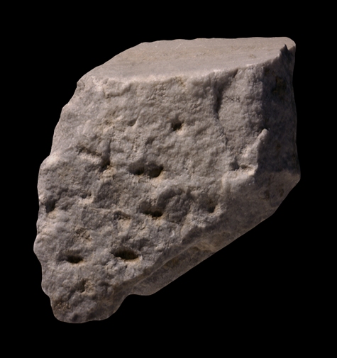 Identification There were many blank areas on the Marble Plan, including the spaces occupied by the Tiber River (see fragment 24d), by gardens, arenas, temple precincts and courtyards--in short, any space devoid of architecture or human construction. In addition, several rows of large marble slabs occupied the entire lower part of the wall of the aula on which the Plan was installed, and perhaps other walls as well. Blank fragments like this one could have originated from any of these areas.