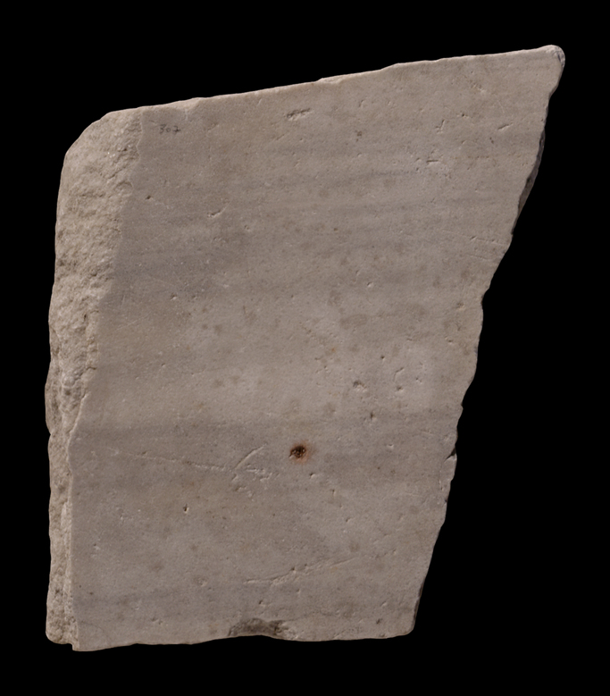 Identification There were many blank areas on the Marble Plan, including the spaces occupied by the Tiber River (see fragment 24d), by gardens, arenas, temple precincts and courtyards--in short, any space devoid of architecture or human construction. In addition, several rows of large marble slabs occupied the entire lower part of the wall of the aula on which the Plan was placed, and probably also the other walls in the room. Blank fragments like this one could have originated from any of these areas.