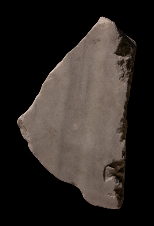 Identification There were many blank areas on the Marble Plan, including the spaces occupied by the Tiber River (see fragment 24d), by gardens, arenas, temple precincts and courtyards--in short, any space devoid of architecture or human construction. In addition, several rows of large marble slabs occupied the entire lower part of the wall of the aula on which the Plan was placed, and probably also the other walls in the room. Blank fragments like this one could have originated from any of these areas.