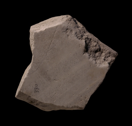 Identification There were many blank areas on the Marble Plan, including the spaces occupied by the Tiber River (see fragment 24d), by gardens, arenas, temple precincts and courtyards--in short, any space devoid of architecture or human construction. In addition, several rows of large marble slabs occupied the entire lower part of the wall of the aula on which the Plan was placed, and probably also the other walls in the room. Blank fragments like this one could have originated from any of these areas.