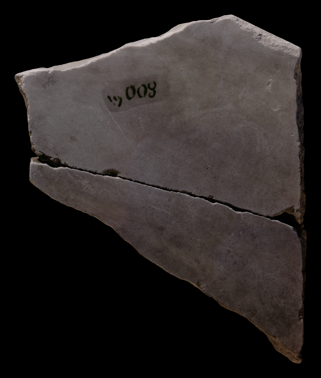 Identification There were many blank areas on the Marble Plan, including the spaces occupied by the Tiber River (see fragment 24d), by gardens, arenas, temple precincts and courtyards--in short, any space devoid of architecture or human construction. In addition, several rows of large marble slabs occupied the entire lower part of the wall of the aula on which the Plan was placed, and probably also the other walls in the room. Blank fragments like this one could have originated from any of these areas.