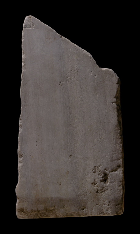 Identification There were many blank areas on the Marble Plan, including the spaces occupied by the Tiber River (see fragment 24d), by gardens, arenas, temple precincts and courtyards--in short, any space devoid of architecture or human construction. In addition, several rows of large marble slabs occupied the entire lower part of the wall of the aula on which the Plan was installed, and probably also other walls. Blank fragments like this one could have originated from any of these areas. The strong blue veining of this fragment may indeed indicate that it was part of the wall revetment elsewhere in the Aula, rather than of the Plan itself.