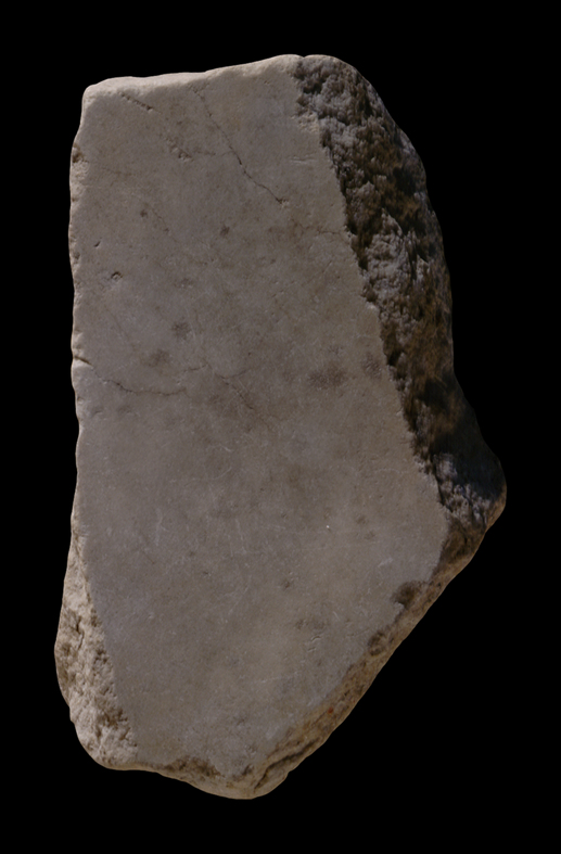 Identification There were many blank areas on the Marble Plan, including the spaces occupied by the Tiber River (see fragment 24d), by gardens, arenas, temple precincts and courtyards--in short, any space devoid of architecture or human construction. In addition, several rows of large marble slabs occupied the entire lower part of the wall of the aula on which the Plan was placed, and probably also other walls. Blank fragments like this one could have originated from any of these areas.
