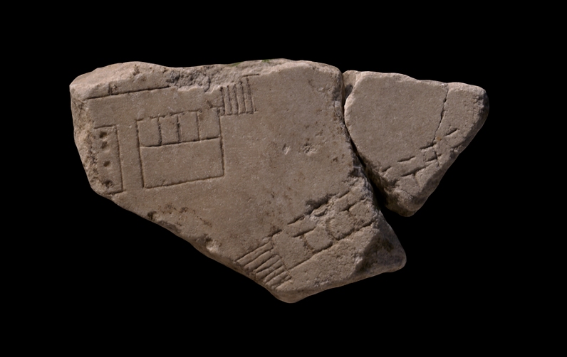 | Description At the bottom of the joining fragments lies a row of rooms, probably tabernae, faced by an arcade and flanked on the left by a wide set of steps. They back onto an open space. Another set of stairs leads from an open area in front of the shops to a group of buildings in the top left corner. The structure to the right consists of a large courtyard fronted by four smaller rooms; in the partially visible structure to the left a row of four columns are placed at the end of a room.