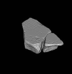 Identification The tabernae depicted in the upper left corner of this fragment are of the most common type of shops on the Marble Plan. Each shop consisted of a single room with a wide opening towards the street that could be screened off at night. The owners perhaps resided with their families on a wooden platform in the back of the shop. The courtyard behind the four tabernae, top left, would have provided the shops with a common work area. Although rarely indicated on the Plan, all the tabernae that backed onto this yard would have had an opening in the rear that provided access to the space. Such rear courts are common on the FUR -- a few other examples are frs. 281, 184 and 279ab (Reynolds 1996, pp. 163-64). In general, such courtyards provided air, a work area, and perhaps even a pleasant garden setting which was an especially desirable feature in the crowded city. The two sets of exterior stairs suggest that the fragment depicts a hilly section of Rome. The covered arcade that fronts the tabernae at bottom right signifies that these shops had a second storey or a mezzanine level, which would have provided the shop owners with additional living or storage room. The formal aspect of the internal columns in the building top left, the variety of building shapes, the carefully planned placement of stairs, the spacious area between the tabernae, and the hilly geography signal a type of cityscape which one might expect to find at the foot of central hills such as the Capitoline or the Palatine.