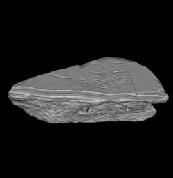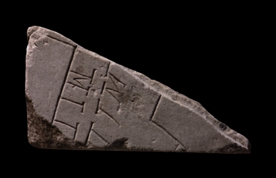 | Description The small fragment constituted the corner of a slab. A clamp hole is visible along the left edge. On the left, a row of tabernae and a staircase back onto the corner of a right-angled space. These shops face a parallel wall with openings across a narrow street or alley. Two openings provide access to a larger space behind the wall. Another entry next to them leads to a staircase. The corner of another building within the area of this larger space is visible in the right corner of the fragment.