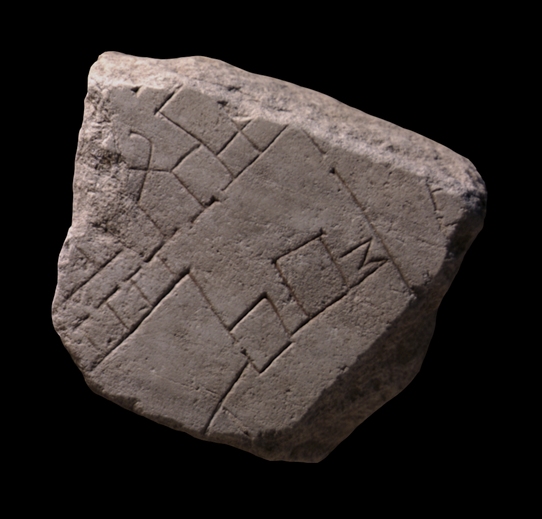| Description A distinct, horizontal veining line crosses the fragment. In the center of the piece a large, rectangular hall is depicted. A narrow opening in its right wall gives access to another large space. Two smaller rooms and a staircase are situated at the bottom of the central hall. The rooms do not seem to be accessible from the large hall, but the one in the lower left corner opens onto another large hall or enclosure. This area is flanked on the left by a row of shops, parallel to the front of the central hall. In front, the central room has two openings; one leads to a room topped by a strange, caduceus-shaped feature which might represent an arch or barrel vault (is this an elaborate entrance?); another opens to a closed room. Three other rooms share the front wall of the central hall but do not seem to be related to it.