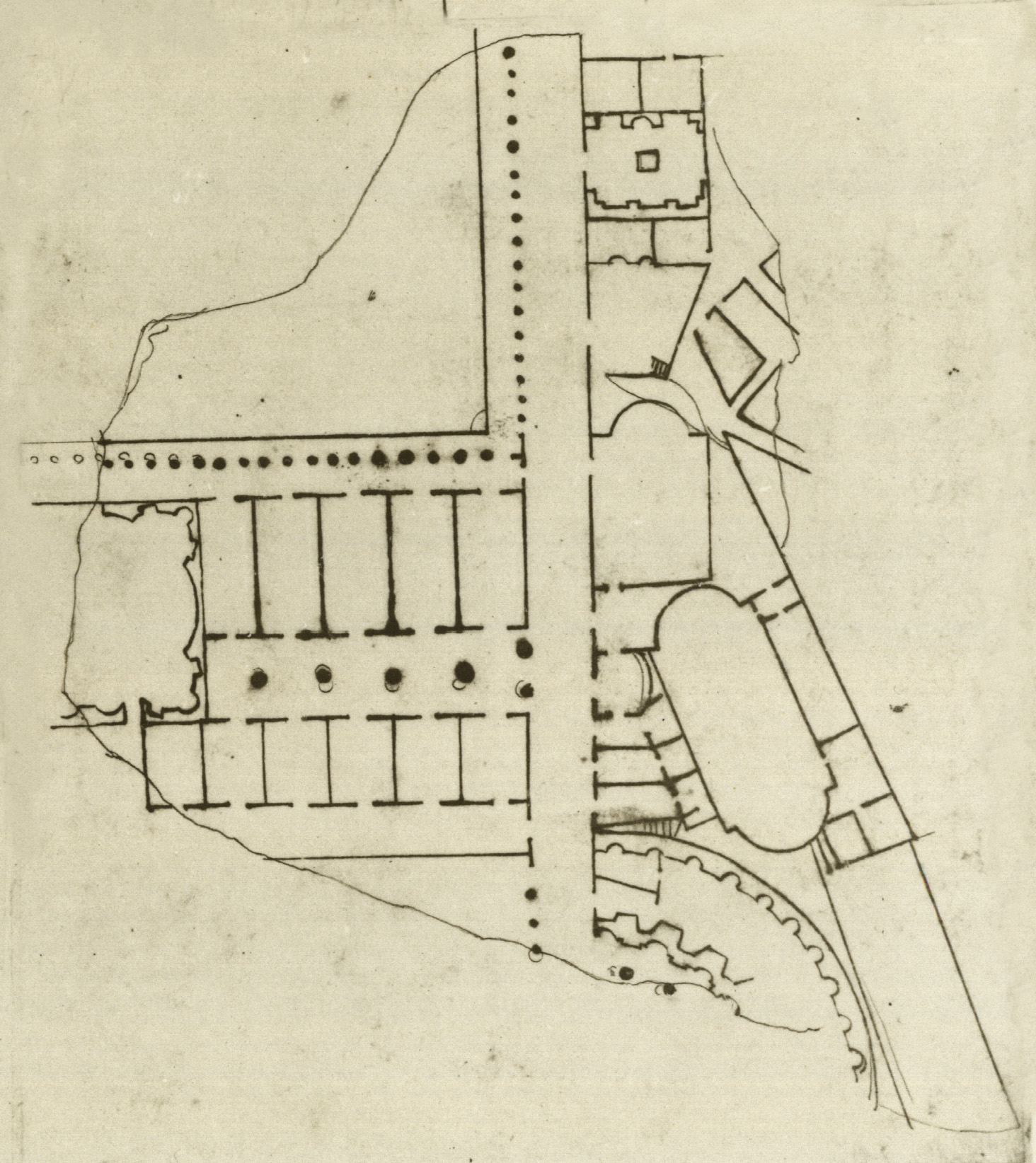 | Description Apart from the bottom portion (now fr. 10m) this fragment is largely lost. However, Renaissance drawing Cod. Vat. Lat. 3439 - Fo 23r (see photo detail above or PM 1960, pl. 14, no. 3) shows the piece as it looked in the later 16th c. At the bottom of the fragment is part of a large, curved structure, with niches all along the interior. Just inside this larger curve is a smaller curve with niches along both the inside and the outside. Just inside this inner curve are two dots; they appear to have been the first two in a line of columns curving along the interior of the apse. In front of the apse ran a straight corridor; it was separated from an open space beyond by a straight row of columns, of which three can be seen on this drawing. The corridor runs straight up the fragment, separating it in two. On the left, just above the three columns and open space beyond, an opening in the corridor allows entry into a perpendicular passage that gives access to a horizontal row of rectangular rooms with doorways at top and bottom. Above, a corridor with central colonnade separates the bottom row of rooms from another horizontal line of rectangular rooms with doorways at top and bottom. These are all longer than the lower row of rooms. To the left, the colonnaded corridor and the series of long rooms abut a large space whose internal walls alternately curve outward along the walls and dip deeply into the corners with three niches in each corner. In the top left corner of the fragment, flanked below by the long rooms and on the right by the central corridor, is a large rectangular or square open space. A single colonnade and what is perhaps a step frame the open space on the bottom and on the right. Part of this space can be seen on fr. 10m.