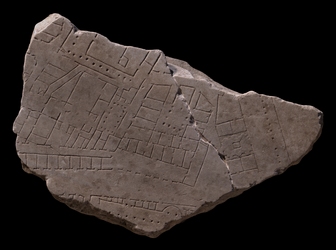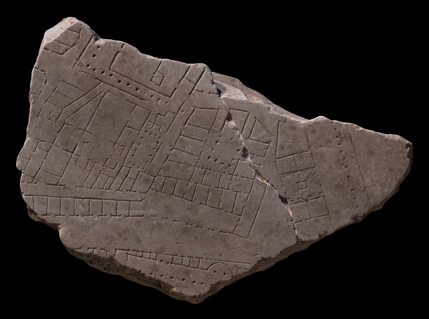 Identification: Subura This fragment represents a section of the residential and commercial district called the Subura. Archaeological and epigraphical evidence, in conjunction with the names of Medieval churches and quotes from Martial, locate the approximate boundaries of the Subura neighborhood. It began near the Argiletum and the Roman forum, and from there stretched, at least in imperial times, northward up the valley between the Quirinal and Viminal Hills and eastward between the Oppian and Cispian Hills, where it probably reached as far as the Esquiline Gate (LTUR IV, p. 379). An inscription (CIL 6.9526) indicates that in the imperial period the area was divided into two sections: the Subura maior and the Subura minor. The greater Subura has been identified with the largely commercial area near the Forum Romanum, between the Viminal and the Oppian Hills, and the lesser Subura with the upper section between the Cispian and Oppian Hills where the major thoroughfare of the Subura, the clivus Suburanus, ascended towards the Esquiline Gate (LTUR IV, p. 380). Roman poets like Martial and Juvenal described the Subura as a sordid commercial area, riddled with violence, brothels, and collapsing buildings. In reality, it was probably not different from any other neighborhood in Rome where commercial activity intermingled with the religious and political life in the great public monuments and smaller local shrines and scholae, and where the large domus of the rich stood next to the decrepit apartment buildings that housed the poor. An abundance of evidence demonstrates that even in imperial times the Subura housed senators (probably on the upper slopes) as well as sandal makers, blacksmiths, and cloth sellers (LTUR IV, pp. 382-383). The apartment buildings and shops that crowd a large part of this fragment attest to this image of the Subura neighborhood.