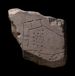 | Description The fragment depicts a large, irregular structure, probably open to the sky. At the left end a square feature is surrounded on three sides by columns. Four small rooms open onto the central space from the left. Two outward-facing rooms, perhaps tabernae, flank the large area at top; these face an open space or wide street which may turn and continue down the left side of the irregular central feature. At bottom, the hall shares a wall with another colonnaded, and perhaps arcaded, structure.
