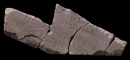 | DescriptionThree of the four joined fragments were part of a slab edge. A distinct veining line traverses the entire fragment group. Occupying most of the center is a large, three- or four-sided porticus with an inscription, PORTIC[US] LIVIAE, traversing the central courtyard. A double colonnade surrounds the courtyard. A small, square, crenellated feature appears right above the P of the inscription. Below the inscription, in the center of the courtyard, a large rectangle encloses a smaller rectangle with a circle inside. Two exedrae punctuate the left backwall of the porticus: a semicircular niche at top, and a rectangular, tetrastyle niche below. NB. In the drawing of this fragment in AG 1980, pl. 8, the rectangular niche is incorrectly shown as opening onto an elongated stretch of rooms outside of the building. As seen in the Stanford photograph, the niche is completely closed off from this row of rooms. A larger exedra is located behind the right wall. To the right of the porticus a section of a circle or semicircle with a crenellated interior edge is visible. A set of steps leads up to the building of which the semicircle was part. Between the steps and the exedra in the right side of the porticus is situated a square feature. A dense conglomeration of rooms, shops, alleys, streets, and porticoed courtyards crowd the area to the left of the porticus. A street runs from bottom left towards the upper right of fr. 10o where it splits in two. The left fork moves upwards and disappears at top of the fragment; the right fork continues its diagonal path towards the upper right. Where it meets with the porticus, it turns and follows the left side of the building to the top of the fragment. Tabernae flank a short stretch of the right side of this street at the bottom. Another four separate buildings are situated in the mainly triangular area between the diagonal street and the porticus. One seems to consist of a colonnaded courtyard with a large, distyle room at top and two smaller at the right side. Three others are flush against the left wall of the porticus. Of these, the elongated feature at top is the most interesting: it contains six rooms in a row, the first four interconnecting, and there is no visible access to the building. On the left side of the diagonal street, in the far left corner of the fragment lies a building that consists of a large room with a central rectangle and smaller rooms along the left side. It opens onto a peristyle which again gives access to a few irregular rooms on the right. Above it, the corner of another peristyle is visible. These two buildings are separated from a row of back-to-back tabernae by what looks like an alley. The back row of shops open onto this alley, the front row onto the left fork of the separated street. Between the two forks of the street a series of interconnected rooms, one of which is apsed, another colonnaded.