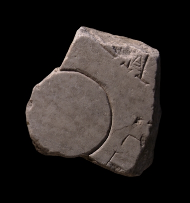 | Description The fragment is dominated by a circular feature; its incisions are deeper and wider than are the incisions elsewhere on this fragment. Two barely visible indentations at the bottom left might represent an entrance (AG 1980, p. 77). The fragment broke along the line of the left half of the circle; in the right half of its outline, traces of red paint (minium) can still be seen. At lower right, a large room opens onto the space around the circular structure. At top right, three doorways open onto the same space in a line; the middle doorway leads to a staircase represented as a V with three transverse bars that may represent upper floors (according to Pedroni 1992, the number of bars in a triangle corresponds to the number of floors in the building). At top left, the fragment edge is straight until it encounters the circular feature; there may have been a straight line here.