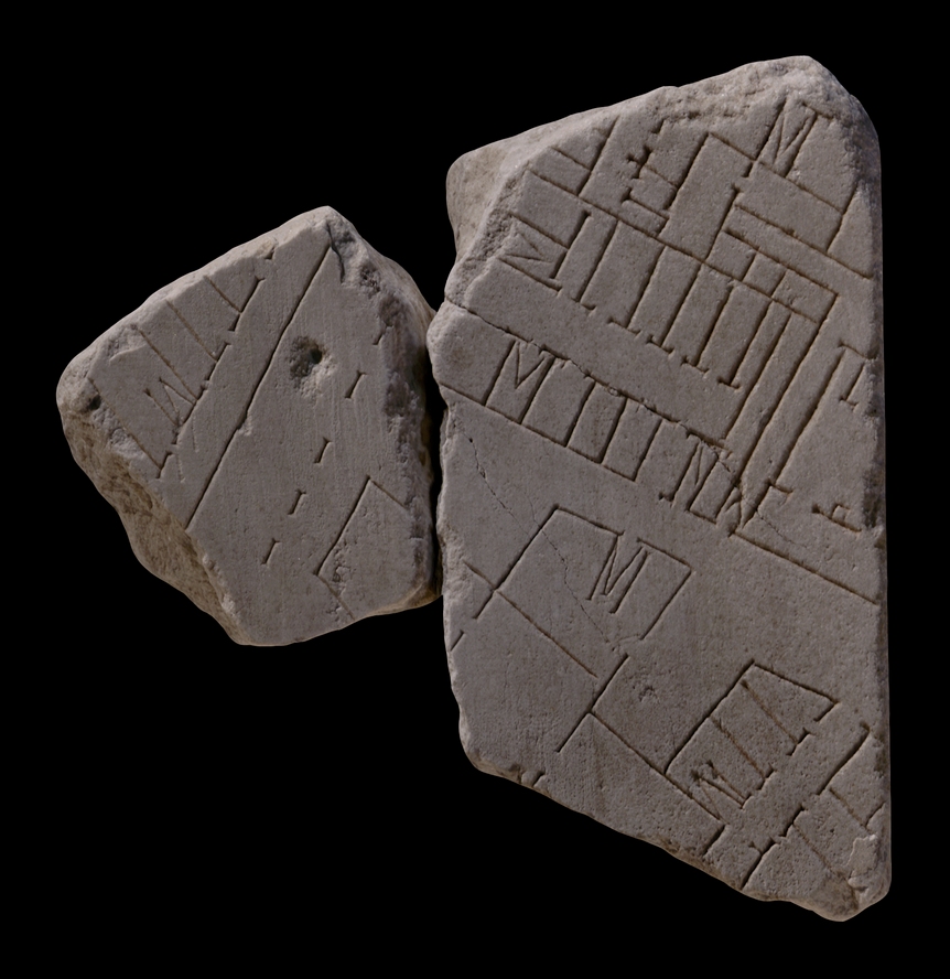 | Description The joining fragments, a and b, formed part of the edge of a slab. Two partial clamp holes are visible on the sides. A row of rooms, perhaps large tabernae, to the left in fr. 111a, is separated from two large clusters of buildings in fr. 111b by a parallel wall or step and an arcade. The large hole in the area between the wall and the arcade seems to be modern. The building that occupies most of fr. 111b consists of a multitude of smaller rooms, some of which face each other across long corridors. Five internal, V-shaped staircases are visible throughout the building. The partially visible structure across the street from the large building consists of four large rooms, perhaps unroofed, and a row of three rooms that faces another row of rooms across a narrow passageway in the lower right corner of the fragment.