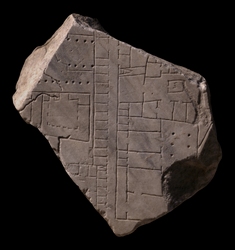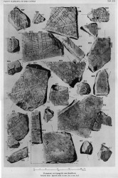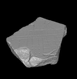 | Description A tassello is visible on the back of the fragment (AG 1980, pl. 9). Strange, worm-like crevices in the surface of the marble may have been caused by roots. A narrow, vertical street divides the architecture depicted on the fragment. It is flanked on the left side by a long row of tabernae. The last room at top of the row is larger than the others and may have had a different function. It perhaps served as an entrance (although no opening is indicated) into a large, apsidal building on the other side of the tabernae. Four columns flank the nave of the apsidal structure on each side. The apsidal building is separated from a large, square structure in the left side of the fragment by a single colonnade. The square building, like the apsidal edifice, has no visible means of access. It is basically a three-sided portico with two small and one large room flanking what must be the entrance to the building. One of the small rooms closest to the presumed entrance may be an altar or pedestal. The square building is separated from the back wall of the vertical row of tabernae by a narrow alley. A set of steps leads from the back of the shops to the large area in which the apsidal and the square buildings are situated. This suggests a change in elevation between this area and the tabernae. At bottom left, a horizontal row of shops back onto the sunken or raised area. A staircase suggests this section of shops was multi-storeyed. The lower right corner of the fragment, on the right side of the vertical street, is occupied by one single building. It has no visible means of access but the entry may have been located on the right side, where the building faced yet another vertical alley. This large building consists of a porticoed courtyard onto which opens a series of rooms. These large rooms all have smaller rooms in the rear. The large building shares a common wall with another large structure in the top right corner of the fragment. This building also does not have any visible means of access, unless the staircase that faces the vertical street represents a rear entry. This building almost has the shape of a traditional domus. What looks like a compluvium is centered in an atrium, which is flanked, at least on the left, by a few rooms. One of them, in the corner, may be a triclinium. The atrium leads to a tablinum which leads to a large space in the rear, perhaps open to the sky and possibly used as a vegetable garden (hortus). Beyond this house, top right, another row of tabernae seems to flank the right side of the vertical street.