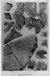 Identification: Vicus Patricius E. Rodríguez-Almeida located this fragment and the joining frs. 11fgh and 11i in the bottom left corner of slab VII-7, based on the similarities (such as marble color, thickness, smooth back, and sawing irregularities) between these fragments and those already securely placed in the top of the slab (Rodríguez-Almeida 1975-76, pp. 274-75, and fig. 8; 1992, pp. 66-68, figs. 15-16). In addition to these similarities, certain features, such as the horizontal street and the porticoed structure in fr. 11fgh, correspond exactly to excavated remains between the Viminal and Cispian Hills (see Rodríguez-Almeida 1975-76, fig. 8). The horizontal street in this fragment can therefore be identified as the vicus Patricius, the street that marked the border between the fourth and the sixth Augustan regiones of the city (Rodríguez-Almeida 1975-76, p. 274; LTUR V, p. 183). The vicus Patricius started at the clivus Suburanus in the south and ran north between the Cispian and Viminal Hills to the Viminal Gate in the Republican city walls (corresponding to modern Via Urbana)(see map in LTUR III, fig. 190). The large structure -- probably an atrium house -- in the top right corner of this fragment has recently been identified as the large domus that held the famous Odyssey frieze, excavated in 1848 (Coarelli 1998, pp. 31-33). The posited association beween this structure and the Papirii family (Coarelli 1998, pp. 33-37) must remain tenuous at best.