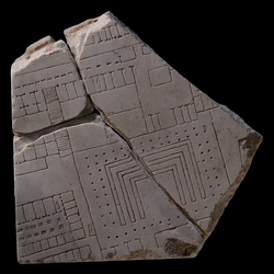 | Description This group of fragments constituted the corner of a slab; three clamp holes are visible. A horizontal street traverses the top of the fragments. It is flanked above by a row of small tabernae. Below, a wall separates the street from the architecture below (D. Reynolds [1996, fig. 3.32] suggests this line denotes a sidewalk, not a wall). Beyond this line, and parallel to it, lies an arcade. To the right, the arcade is blocked by a small room. Behind the arcade and facing it is a row of tabernae, separated in the middle by a long, stepped ramp. The shops on the left of the ramp have back rooms, and back onto what seems to be another row of shops with back rooms; those on the right are plain and back onto a large, rectangular space, perhaps open, which is divided into three compartments. To the right of this space lies a large building, accessed only through a small opening in the upper left corner. In the back, six irregularly sized rooms face the center of the building. Two larger rectangles with two smaller square features right next to them are placed in the center and towards the front of the building. Behind this secluded building, and occupying most of the lower right corner of the fragment group, lies a large porticoed structure. Its only access seems to be through a small opening in the upper right corner. A colonnade, double except along the bottom, surrounds three clamp-shaped features in the center of the building. These open up towards the bottom. A row of small rooms on the left and an elongated feature on the right, barely preserved, face the single colonnade at the bottom. The bottom left corner of the fragment group is a large, open space in which a partial building is visible. The long ramp seems to connect this open space to the arcade at top. Another set of stairs, placed along the right wall of this space, perhaps provided access to the top of the porticoed building to the right. The partially visible structure in this open space consists of three rows of rooms that face inwards towards a central, narrow courtyard lined with columns. These columns are rendered with recessed squares. The corner of another building, perhaps similar, is visible in the lower left corner of the fragment.