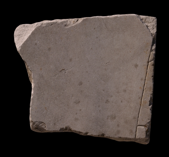 | Description The right side of this large fragment was part of a slab edge. A clamp hole is visible in the upper right side. A long straight line runs at a slightly oblique angle to the right edge. A short, perpendicular line extends from this line to the right edge in the bottom right corner. Another vertical straight line, maybe just a scratch but possibly a guide line, traverses the fragment at an almost parallel angle to the other long line.