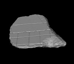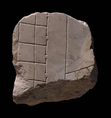 Identification E. Rodríguez-Almeida joined this fragment to fr. 667 based on the rough back of both (Rodríguez-Almeida 1992, pp. 62-63). Using computer algorithms, D. Koller of this Stanford project has in addition matched this fragment with fr. 156 (Koller-Levoy 2005). The match is confirmed by the aligning architecture, the similar ductus and thickness, the rough backs, the fracture angle of the bottom surface, and a distinct two-tone colored band in the marble of all three fragments. Together, the three pieces show a row of shops facing a street and a triangular or trapezoidal courtyard or open space. The tabernae also seem to back onto a large courtyard. The most common type of tabernae on the Plan consists of a single room that opens directly onto a street. This type of shop could function as a shop, as a dwelling, or, probably more commonly, as a combination of the two. In single-room shops, a wooden loft probably served as the actual dwelling area (Reynolds 1996, pp. 158-9). This fragment may depict a type of tabernae that had an additional room in the back. Such structures have been found in both Ostia and Pompeii. The back room was either used as the family residence or, if the front room had a loft, as a work and/or storage space. Other examples of such tabernae can be seen in frs. 11a, 11c, and 11fgh (Reynolds 1996, fig. 3.13).