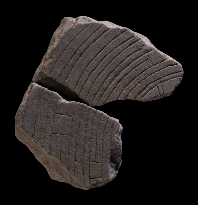 | Description The joining fragments depict part of fourteen concentric circles, five of which are recessed double lines. Three rectangles interrupt the curved lines at irregular intervals. Two parallel, recessed double lines connect the two innermost, double circles at top right. A vague guideline runs between the parallel lines and crosses the concentric circles.
