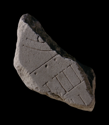 | Description The horizontal line with adjacent dots that traverses the fragment represents a section of a portico. Two rows of rooms, one behind the other, face the colonnaded walkway. Above the portico, a section of a curved structure is visible; it is rendered with two double lines, widely spaced. The firm endings of the double lines before they meet the upper left edge of the fragment represent an opening in the curved structure. The circular part of a letter from an inscription touches the inner line of the curved structure.