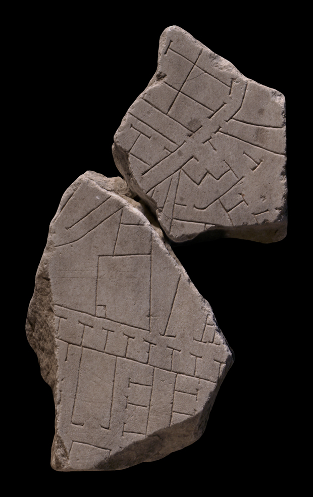 Two attached fragments, 141a is the upper fragment and has an original edge on the right side. 141b is the lower fragment with a small stretch of original slab edge with clamphole on the lower edge. A small and curvy street is visible running top right to bottom left in the upper half of the combined fragments. This street is flanked on the left by a structure with 6 back-to-back rooms and several irregular shaped rooms below.