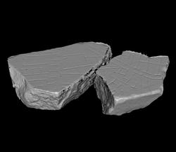 (Koller-Levoy 2005, 8, fig. 20). 5 pairs of corresponding incised linear features angling across the slab boundary resulted in a high matching score. Two of the matching sets of incisions were annotated as the front of a row of rooms, and another two as the back of a row of rooms; the fifth set of matching incisions, less definitive than the others, appears as if it may represent the border of a rectangular space.