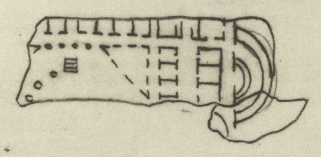 | Description The fragment itself is lost, but Renaissance drawing Cod. Vat. Lat. 3439 - Fo 22r shows it as it looked in the 16th century (see detail above or PM 1960, pl. 13, no. 20). It depicted a colonnaded courtyard, surrounded at top by one row, on the right by two rows of rooms. The inner row of rooms on the right had openings both front and back. Triangular areas, perhaps colonnaded and covered, appeared in the corners of the inner portico. In the center of the colonnaded area, a circular row of columns and a set of steps (?) appeared. Behind the outer row of rooms on the right was a semi-circular, double walkway.