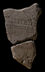 | Description A horizontal row of multi-storeyed tabernae crosses the fragment at top, with the shops facing downwards. (N.B. The singular staircase is missing in the drawing in AG 1980, pl. 12.) Just before reaching the right fragment edge, the back wall of the row moves forward and decreases the depth of the shops on the right. A second row of shops approaches the horizontal row at an angle from above but stops short just before meeting it. The large space thus framed at the bottom and on the right by these rows seems to be open to the sky. The horizontal line that divides it perhaps represents a low wall. A street separates the horizontal row of tabernae from a large hall with a central apse in the back wall. The apse holds what seems to be a statue base. Smaller shops back onto the rear wall of the apsed room and onto a large room to its right, from which it is separated by a thick, recessed wall. In front, the hall is lined with dots within small squares. Elsewhere on the plan, these seem to represent columns on plinths (see front of Porticus Octaviae in fr. 31u. The hall opens onto a large, sunken courtyard, surrounded by a portico. Steps lead from the courtyard to the portico. The entrance to the apsed hall from the courtyard is emphasized by wider steps and columns on plinths. Inside the courtyard lie parallel, elongated features. The leftmost of these is approximately aligned with the right wall of the hall, suggesting that a wide space in front of the hall was left free.