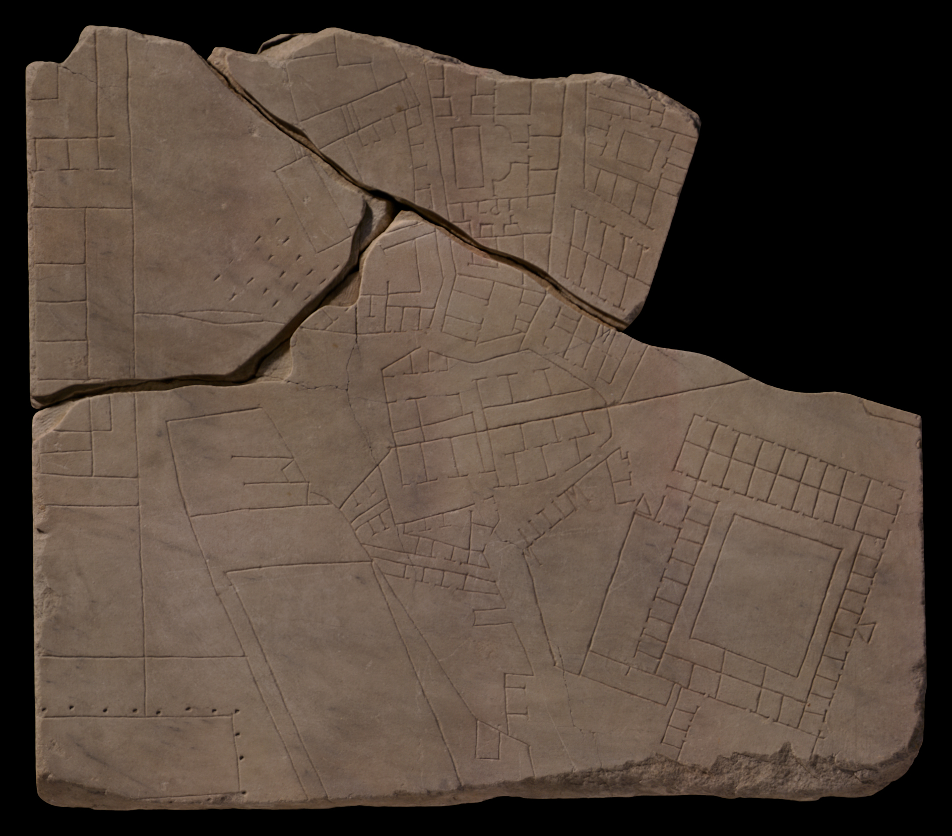 | This fragment group includes a slab edge on either side. Rodriguez-Almeida points out that the width of this slab (89 cm) excludes a horizontal position; it must have stood vertically on the wall. Although we do not have information about the widths of the vertical slabs for large areas of the wall, Rodriguez-Almeida proposes a good candidate: the third slab from the left in the second row of vertical slabs from the top. This slab is the closest in size he has found; the position corresponds to the part of the Quirinal where the Baths of Diocletian were later built (AG 1980, p. 157). |