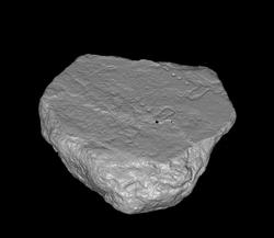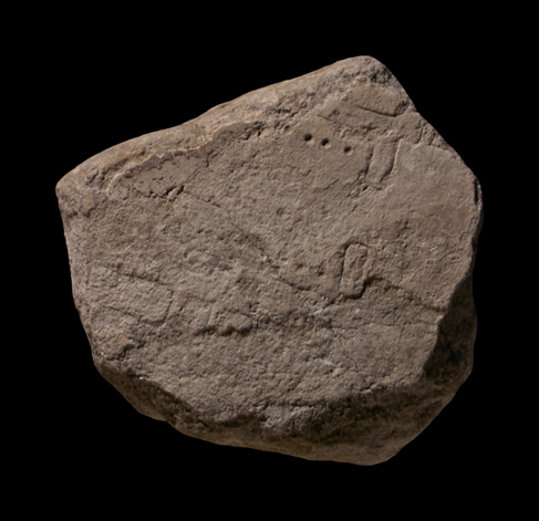 | Description The surface of this fragment is extremely corroded. It is possible, however, to make out the outlines of a temple. The cella, facing right, is rendered with recessed double lines as is common on the Map. Columns lined the cella walls inside; four appear on top; two are visible at the bottom. The temple appears to have been peripteral, as a few columns appear outside the cella; these are also rendered as recessed squares. The pronaos seem to have been fairly deep.