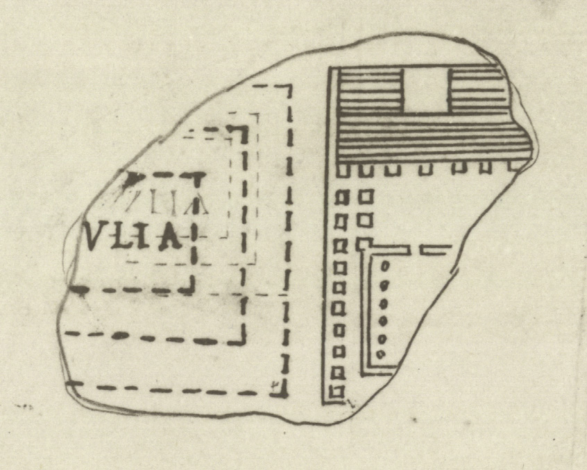 | Description Fr. 18b is now lost, but Renaissance drawing Cod. Vat. Lat. 3439 - Fol 19r shows it as it looked shortly after its discovery (see detailed photo above or PM 1960, pl. 9, no. 9). According to this drawing, the still surviving fr. 18c was once part of this larger fragment. In 1742, a marble copy was made of the missing fragment based on this drawing (see reconstruction in PM 1960, pl. 21 or AG 1980, pl. 13), and fr. 18c was incorporated into this copy (see fr. 18bc). On the right, two thirds of a temple appeared. It was a podium temple with a wide frontal staircase and central platform or altar, a deep pronaos, and a small cella with interior columns along the sides. The temple seemed to be octastyle, with eleven columns along the sides. The columns in front were rendered as if they were part of the edge of the podium; those along the sides were placed at a small distance from the edge. On the left was another structure, separated from the temple by a narrow street. It consisted of three rows of arcades, wrapped around a central space in which the letters VLIA appeared. Vague pencil marks show that the Renaissance draftsman originally drew this building on a much smaller scale.