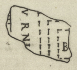 | Description Fr. 18d is now lost, but Renaissance drawing Cod. Vat. Lat. 3439 - Fol 22r shows it as it looked shortly after its discovery (see detailed photo above or PM 1960, pl. 13, no. 24). The fragment depicted on the right a building that consisted of three arcades surrounding a central hall. An inscription, of which only the letter B was visible in this fragment, was placed in this central space. In the left side of the fragment, the wall of a building appeared. It was labeled by an inscription [---]VRNI[---]that was placed between the two buildings.