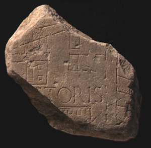 | Description The two small pieces are now missing but the 19th-century photograph above shows that they originally adhered to the lower left side of fr. 18a, depicting a section of a temple podium. Shown in these pieces were the letters [...]AS[...] and below, two horizontal double lines with at least two outlined squares approaching the lower line from below.