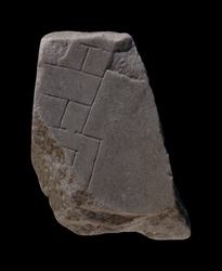 (Koller-Levoy 2005, 8, fig. 20). 5 pairs of corresponding incised linear features angling across the slab boundary resulted in a high matching score. Two of the matching sets of incisions were annotated as the front of a row of rooms, and another two as the back of a row of rooms; the fifth set of matching incisions, less definitive than the others, appears as if it may represent the border of a rectangular space.