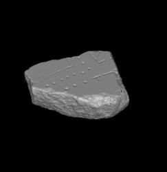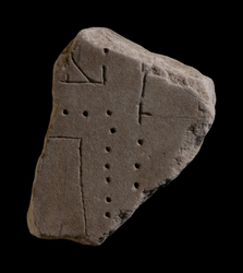 | Description The lower right portion of this fragment depicts the upper left corner of a large portico; an interior line may represent a central pool or garden area within the portico. The upper, horizontal walkway continues to the left and off the fragment. On the lower left, the corner of a structure with a curved apse or exedra inside, is visible; it has access to the horizontal passageway. From the right, the horizontal walkway is lined above by a colonnade, then by a T-shaped pier and a straight wall. A vague guide line (?) seems to run from the stem of the T-shaped pier to the top of the fragment. In the upper left corner, a tiny feature, too small to identify, is visible.