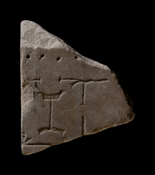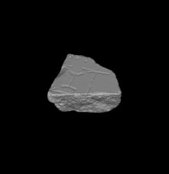 | Description The fragment was part of a slab edge; a partial clamp hole is visible. A horizontal colonnade traverses the piece along the top. Below the colonnade, and parallel to it, lies a wall with two openings visible. The openings lead to two rooms, situated side by side, that are connected via an opening in the vertical wall common to the both. The back wall of the room on the left is barely visible at the bottom of the fragment. This room contains an H-shaped feature, and curved features in the corners of both rooms perhaps represent apsidal spaces within each room.