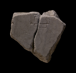 | Description The joining fragments depict an open space with a square platform at top center. The platform was approached from two sides by wide steps and seems to have had a small, rectangular addition at the bottom.