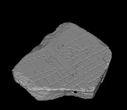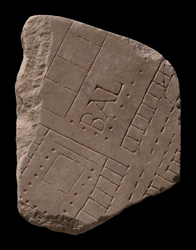 | Description The upper half of the fragment is occupied by the end of an elongated building. It consists of an open space, labelled with the letters BAL and delineated on the short and on the rightmost long side with a colonnade. Two guide lines are visible at top of the inscription and two thirds down. The open space is flanked on the left by a row of interconnecting rooms and on the right by a row of outward-facing tabernae. In front of the tabernae lies an arcade, probably covered. A street runs parallel to the arcade, faced on the opposide side by another arcade and another row of shops. The elongated building is separated from another structure that occupies the bottom third of the fragment. It consists of an open courtyard, flanked on the left by rooms that open onto the yard and on the left by tabernae that back onto it. Two of the tabernae on the right give access to the court. Inside the court yard lies a square feature with two small openings, one in center front, another in the right rear. The square feature is surrounded in front and along the sides by a colonnade and in the back by a closed wall. A set of steps may have run along the entire frontal colonnade.
