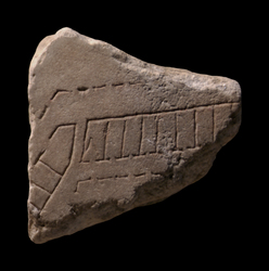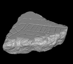 | Description The far right corner of the fragment was part of a slab edge; a partial clamp hole is visible there. It depicts two rows of tabernae that meet at an oblique angle and are separated by a narrow alley. A staircase in the leftmost shop demonstrates that the horizontal row of shops was multi-storeyed. Arcades run along the outside and the inside of the tabernae. It is uncertain whether the bottom arcade frames a street or a courtyard.