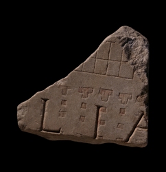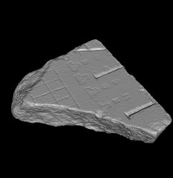 | Description This fragment belonged to the right side of a slab; a partial clamp hole is visible. Traces of minium survive in the letters and in some of the architectural symbols. At the top of the fragment is a horizontal row of tabernae with back rooms. Below these tabernae, across a narrow street, lies a large structure consisting entirely of rows of square piers. Three horizontal rows crossing seven vertical hallways are visible here. A line of thick, T-shaped incisions represents the outer edge of this building, the spaces between the Ts being doorways at the end of each hallway. It is this building's piers and its associated inscription that are outlined, recessed and highlighted in red; the tabernae are represented by a single line (originally painted red), as is usual on the Plan.