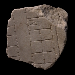 Identification Rows of tabernae are one of the most common features on the Marble Plan. In general, the shops consisted of a single room with a wide opening towards the street that could be screened off at night, and the owners probably resided with their families on a wooden platform in the back of the shop. The tabernae in this fragment are slightly more luxurious and not that common on the Plan. They consist of a front room which would have functioned as the shop, and a back room that would have provided the shopowner with a living space, storage, a working area, or some combination of these. The narrow opening in the back provided private access to the room from the outside. Other examples of tabernae with openings on two opposite ends are visible in frs. 11e (top left), 496a (bottom), and 544 (Reynolds 1996, pp. 160-61, fig. 3.11). None of these examples, however, incorporates the wall that separates the front and the back rooms as does this fragment.