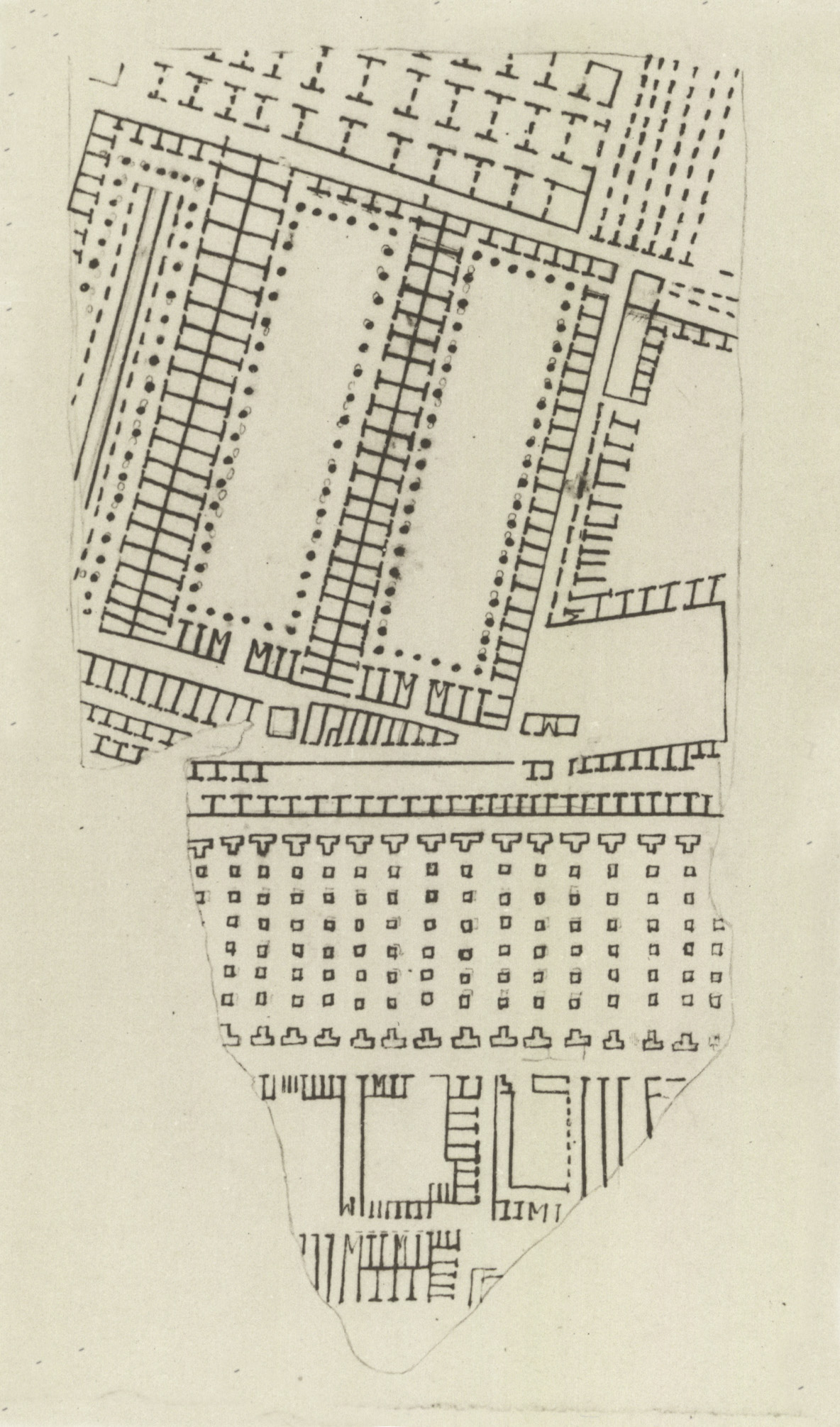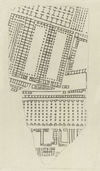 | Description This large fragment, now missing, made up the entire upper half of slab VII-18. Fortunately, a Renaissance drawing, Cod. Vat. Lat. 3439 - Fo 15r (see photo detail above or PM 1960, pl. 4), shows the piece as it looked when still joined with fr. 24c. The fragment depicted sections of four large buildings, engraved at an oblique angle across the marble piece. Narrow streets separated the buildings from each other. The structure in the top left corner was divided into three long rows of rooms by two narrow passages. The rooms in the central row had openings at both ends, while those in the top and bottom rows opened inwards. All rooms had access to each other via two openings in their side walls. A few of the rooms to the left in the bottom row also seemed to be accessible from the outside. Below this building lay a structure that consisted of three parallel, joining courtyards. Each courtyard was flanked on all sides by inward-facing rooms and by an inner colonnade. In the leftmost courtyard, a central feature rendered as a double track with a stipled line on each side, may have represented a water basin surrounded by arcades (AG 1980, p. 103). Stairs flanking the central openings at the bottom of the two courtyards on the right demonstrate that these were multi-storeyed. The building in the top right corner of the fragment consisted of six long, parallel arcades. Finally, the building below it was an open courtyard that was surrounded on at least three sides by inward-facing rooms. Some of the rooms on the left side also opened onto the arcade that flanked that side of the building. A double arcade faced it a top, and two rooms, one long and seemingly inaccessible, the other small with an opening into the top arcade, were situated in the top left corner.