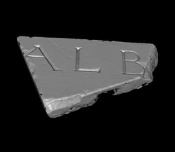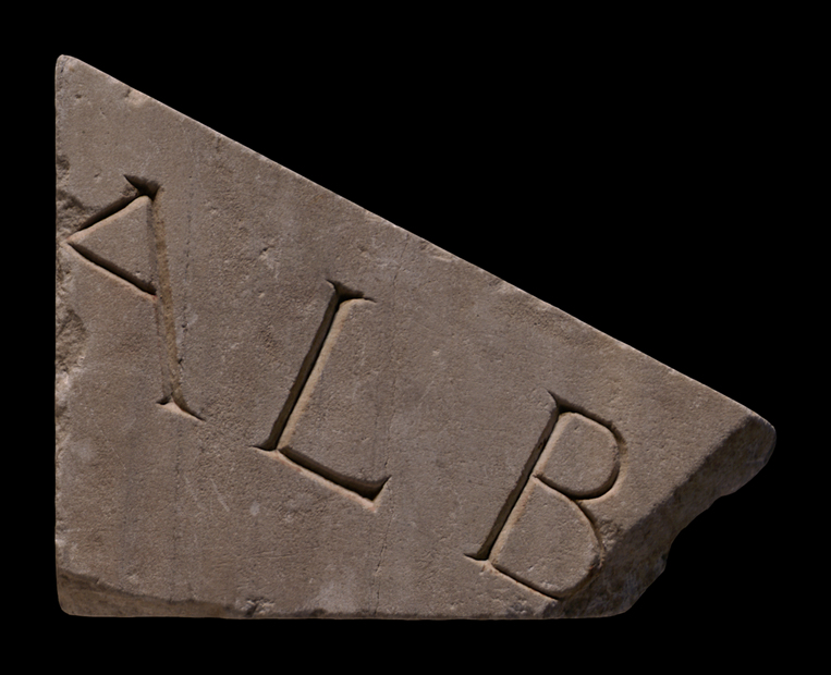 | Description The fragment was the corner of a slab. There is a clamp hole along the bottom edge. Three letters, ALB, traverse the piece in an oblique angle to the bottom. Faint guidelines are visible along the top and bottom of the inscription. The straight edge above and parallel to the inscription is the result of modern cutting.