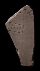 | Description The bottom of this fragment is part of this slab's lower edge. At the top of the fragment lies a horizontal row of tabernae, two with internal staircases. The tabernae face a large open space below, in the center of which two square structures, each divided into three rooms, are visible.