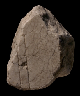 | Description The surface of the fragment is much corroded. On the left side, two parallel lines traverse the piece. The right line stops just before reaching the top edge of the fragment, and it seems to make a left turn, perhaps to connect with the left line. The rest of the fragment is blank.